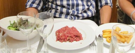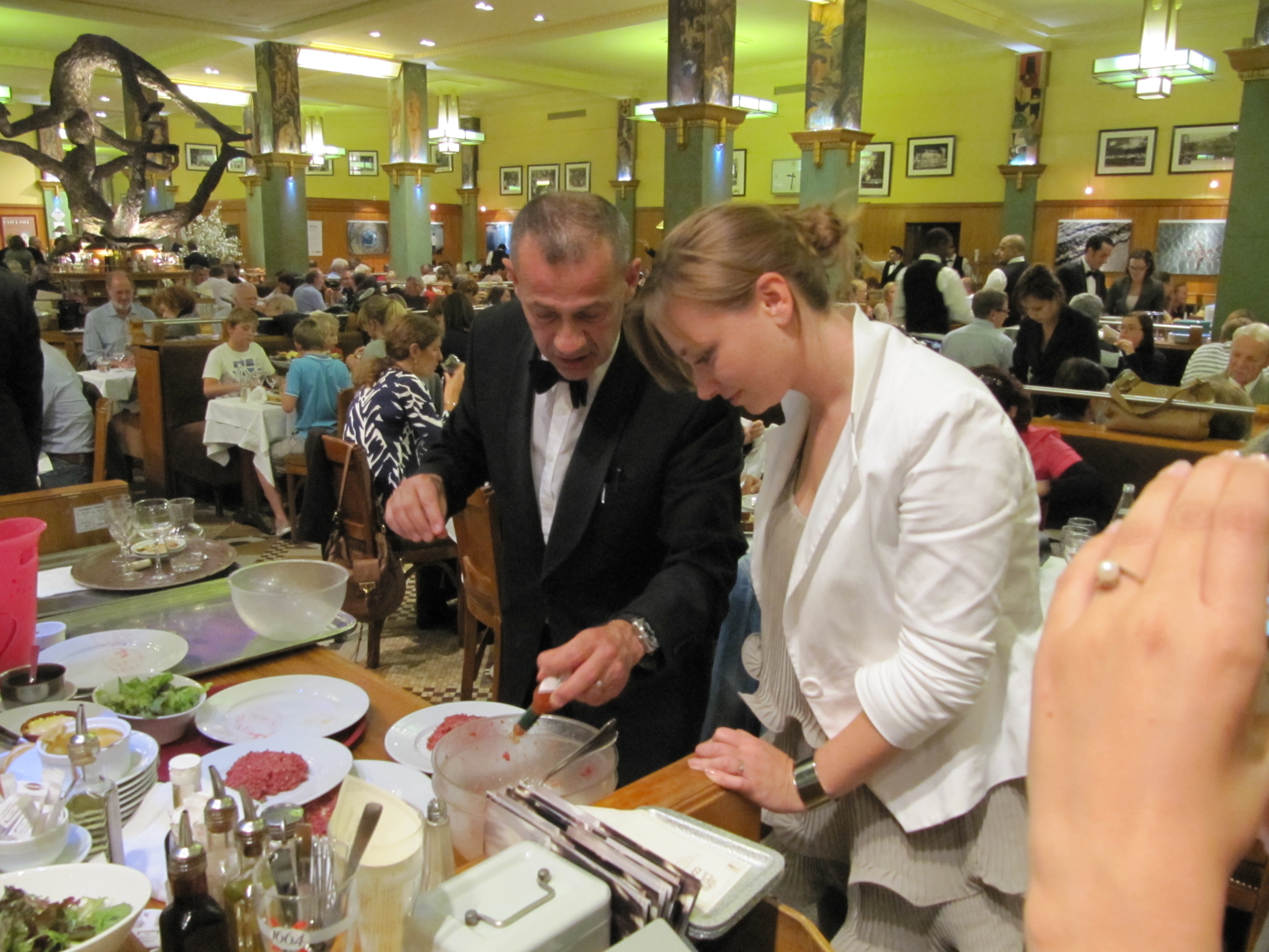 een couvertje of 300 zitten op lange banken aan tafel met wit laken dat regelmatig door de bediening in pak wordt afgeborsteld. La Coupole bestaat al sinds 1927, en ik geloof niet dat het menu veel veranderd is in die tijd. Na een schaal vol oesters was het tijd voor de pièce, tartare de boeuf! Het gerecht wordt grotendeels bij je tafel klaargemaakt, en onze kelner zag hoe nieuwsgierig ik zijn handelingen aan het volgen was. Ik mocht er naast komen staan, terwijl hij de bereiding toelichtte en mij t recept gaf. ‘Pas de ketchup!’, waarschuwde hij nog; ik zou niet durven. Dit recept is gebaseerd op het lesje in La Coupole, maar dan gepresenteerd als voorgerecht.