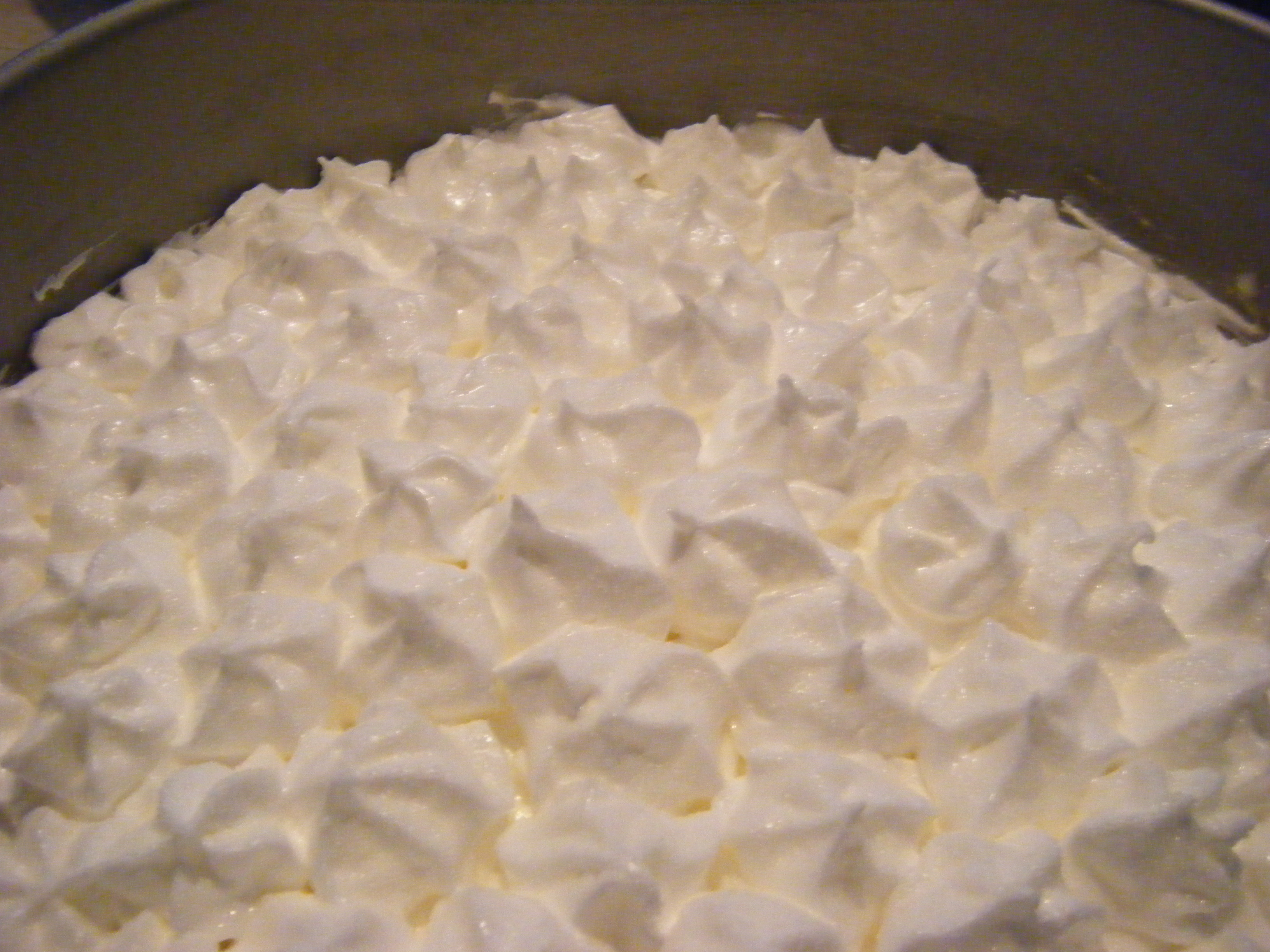 Ook het eiwit verdeel je over de twee springvormen, bij de één strijk je het eiwit glad, bij de ander maak je piekjes, dat kan met een lepel, of, voor een wat geliktere afwerking, met de spuitzak. Over die laatste helft strooi je de laatste el. suiker. Dan gaan ze de oven in, 20-25 min. tot je een satéprikker in het deeg steekt en deze er schoon uitkomt. Als je oven niet groot genoeg is, kun je ze ook één voor één bakken.