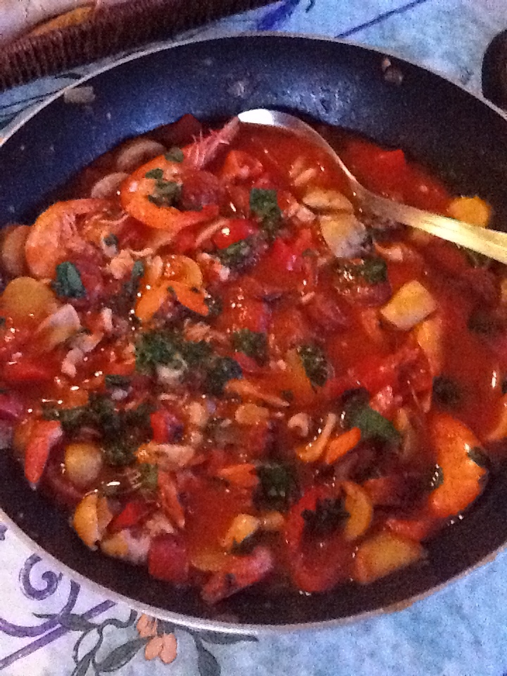 Bak de ui en paprika in olijfolie tot de ui na een paar minuutjes glazig is, voeg de chorizo, knoflook en paprikapoeder toe en bak tot het vet uit de chorizo begint te komen. Gooi de aardappelen in de pan. Doe de tomaat en tomaatblokjes erdoor (heb je smakelijke tomaten, dan kun je de blokjes ook achterwege laten en er wat meer verse doorheen doen), en dan de visbouillion en saffraan. Breng aan de kook en voeg de inktvis toe. Laat 30 minuutjes zacht stoven. Voeg op het laatst stukjes vis en evt. garnalen of schelpdieren toe, en laat die kort meekoken. Proef of de chorizo pittig genoeg is, anders eventueel nog wat chillivlokjes erdoor. Voeg peper toe en zout, indien nodig, want visbouillon kan erg zout zijn. Strooi peterselie erover, en klaar!