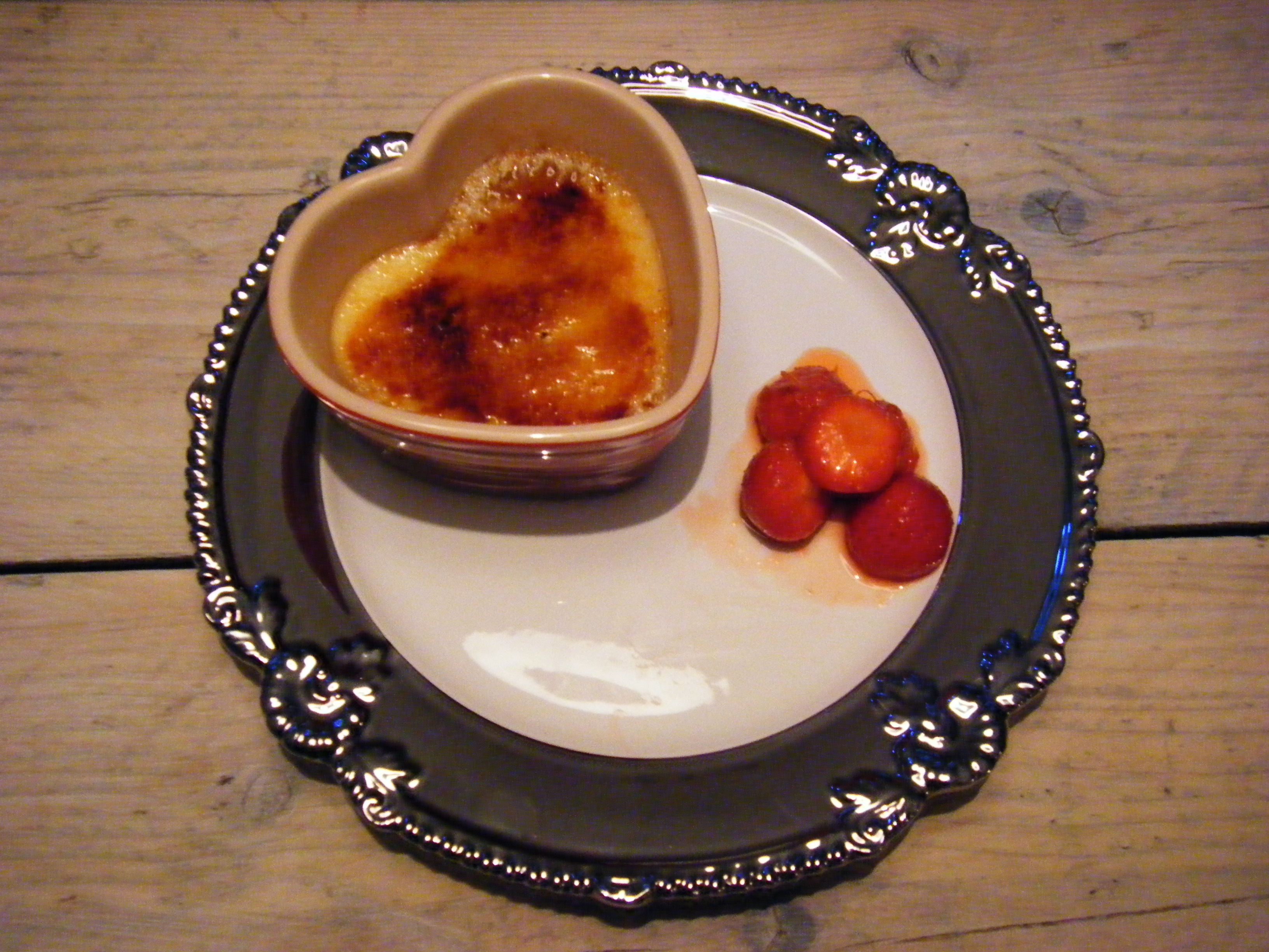 Met het risico dat ik nu echt als alcolist overkom; de crema catalana is nog lekkerder met deze aardbeien in Cointreau ernaast. Die overigens ook zelfstandig als dessert te serveren zijn, zie hier.
