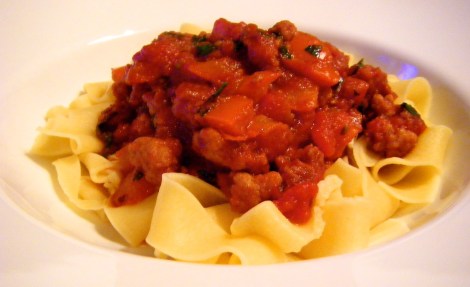 De rokerige ragout van worstvlees is net zo traditioneel als de economie van Italië stabiel is. Het is een stevige pasta met veel smaak en dat komt met name door de paprikapoeder. Gerookte paprikapoeder, in het Spaans pimentón de la vera, is niet in iedere supermarkt te krijgen, venkelzaad ook niet. Dille & Kamille verkoopt wel beide. Niet zo handig als je om half 6 in de supermarkt staat, maar als je die potjes eenmaal in huis hebt zul je ze vaak gebruiken. De pimenton gaat in bijna alles wat Spaans heet en venkelzaad doet ’t goed met vis, varkensvlees en stoofpotjes. Eventueel kun je de venkelzaad ook weglaten en gewone paprikapoeder gebruiken. Maar kom dan niet bij mij klagen dat dit pastaatje niets bijzonders is!