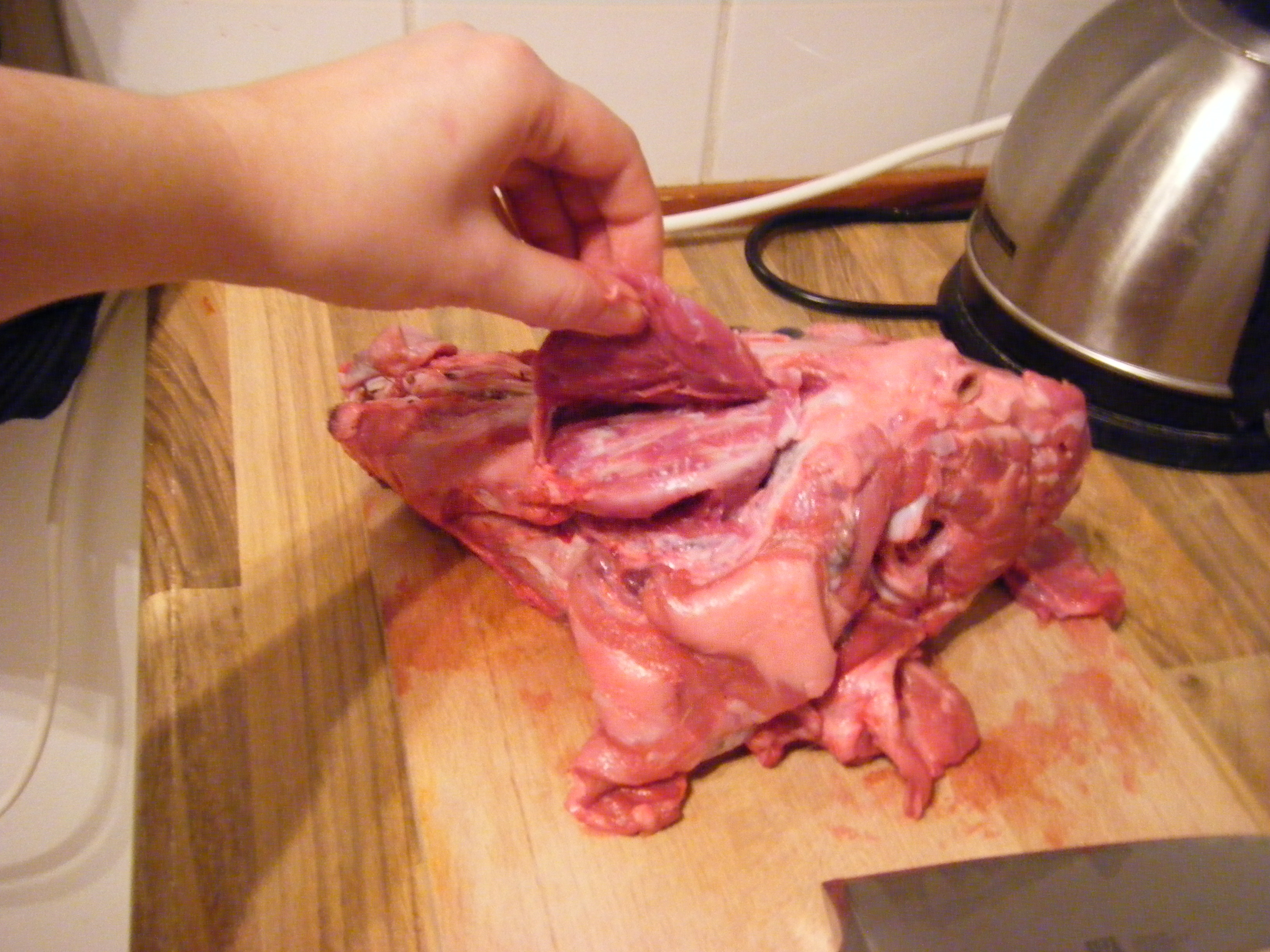 Voorzichtig, en toch een tikkie huiverig, heb ik ze van de kaak losgesneden, met een klein scherp mesje is dat niet eens zo moeilijk. Veel vlees houd je er niet aan over, maar dit waren ook nog maar biggetjes. Van een goed doorvoed varken haal je waarschijnlijk meer. Vraag maar eens aan de slager. Dan hoef je ook niet zelf met zo’n kop aan de slag te gaan, scheelt toch. Duur is het niet, want er is (nog?) weinig vraag naar. Houd er wel rekening mee dat de meeste slagers maar een paar varkens per week te verwerken krijgen, op tijd bestellen dus. Het is de moeite waard hoor, dit kleine stukje vergeten vlees, alleen niet verder vertellen, want er is niet genoeg voor iedereen!