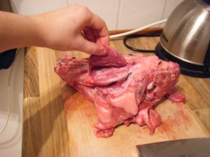 ‘Doe die koppen er ook maar bij’. En ja, daar sta je dan met je grote mond, met twee gevilde zwijnenkoppen, vers van de jacht. Drie grote ogen staarden me aan (één was blijkbaar onderweg verloren). Goed, niet zeuren, maar snijden. De wangetjes wilde ik hebben. Mooi zacht vlees, zeker zonde om weg te gooien.