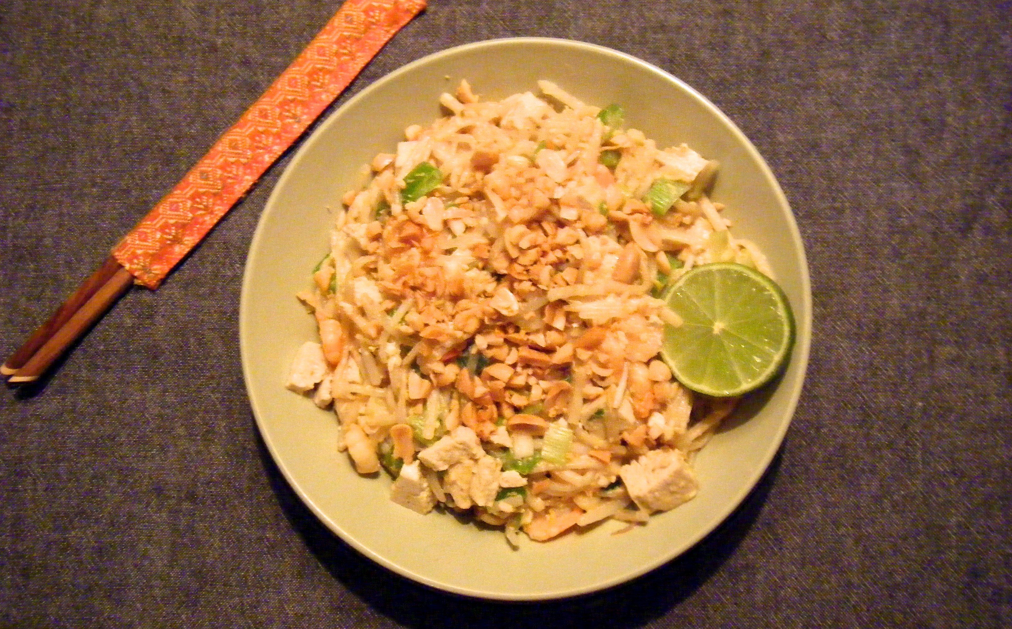 Maar er is één ding waar ik die lui niet op kan pakken, hoe graag ik ook zou willen. Het is niet eens moeilijk hoor, tofu afzeiken. De kleur, substantie, vorm en geur; een grauwe spons die je iedere vleesonthouder gunt. Maar ik vind het wel lekker. Kan er niets aan doen. Op z’n Japans, in de misosoep, gebakken tahoegerechten uit Indonesie of zoals in dit recept: de Pad Thai Noodles. Ik heb het recept geleerd van de kokkin van de Sompet Thai Cookery School, in Chiangmai, Thailand. Maar ook op een vorstige dag in Nederland smaken deze noedels goed, heel goed.