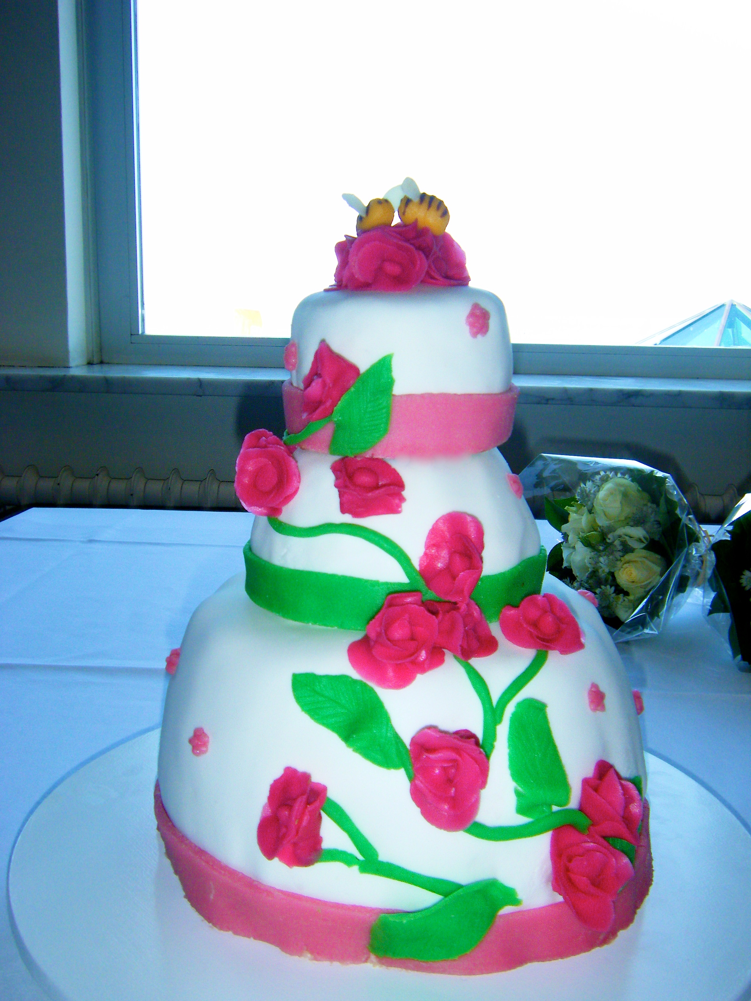 Het is een tijdje stil geweest, maar dat wil niet zeggen dat we hebben stilgezeten bij The Fat Judge. Ik heb inmiddels een nieuw huis en, na een fikse verbouwing, nu ook echt een droomkeuken. Nu gaan we dus echt pas los!!! Maar voor ik weer recepten het web op gooi, eerst nog even een paar plaatjes van een heel fijn projectje. Toen mijn goede vrienden Marianne en Geert gingen trouwen vorige maand, had ik de enorme eer om de taart te maken. We zijn voor een klassieke taart gegaan, met bloemetjes en bijtjes, van chocola met frambozen-limoenvulling. Ik zal niet ontkennen dat ik flink zenuwachtig was toen ik – in het Kurhaus ook nog! – de taart aan het stapelen was. Gelukkig viel de taart enorm in de smaak. En voor het bruidspaar was ook een hapje bewaard…