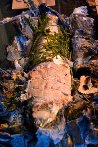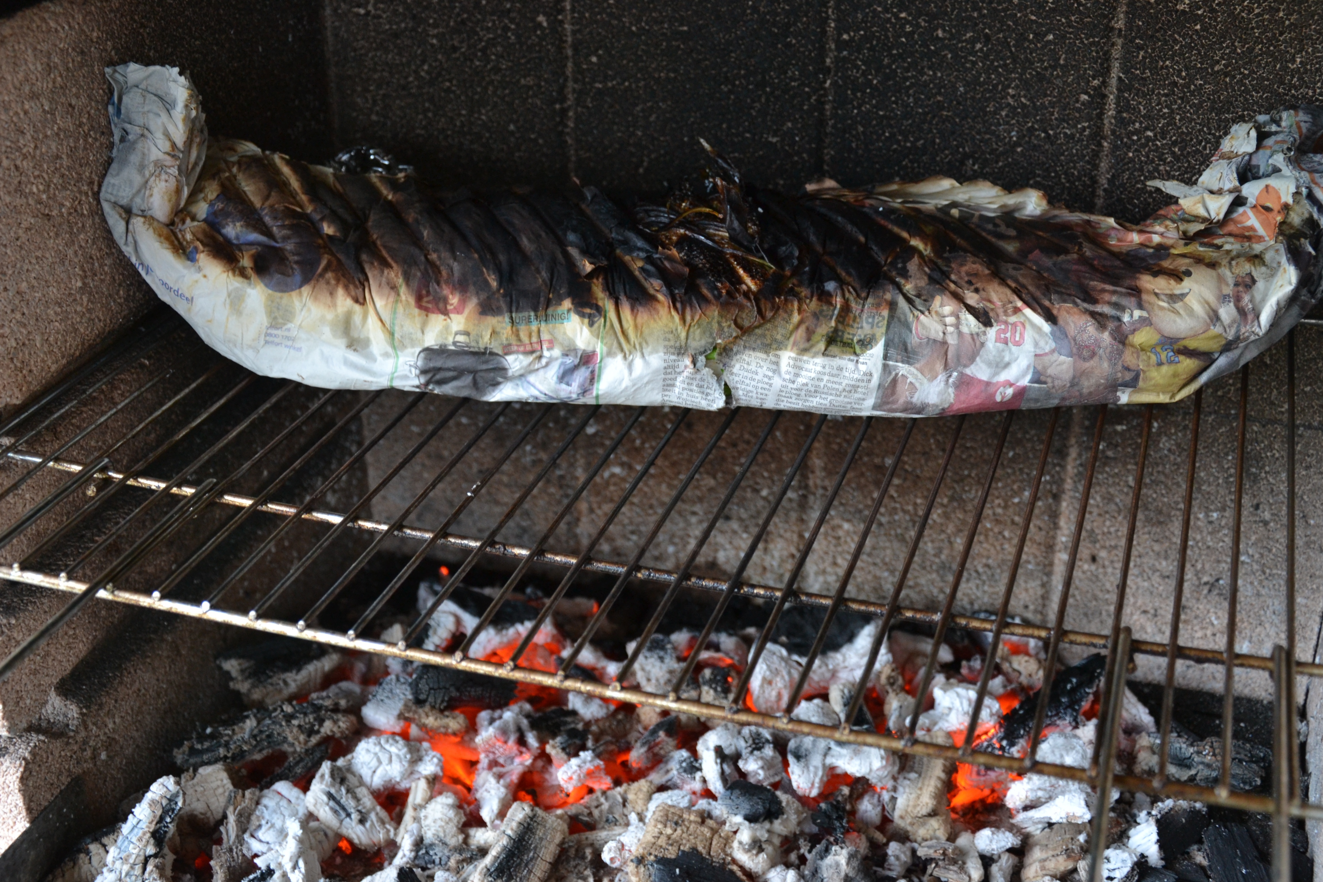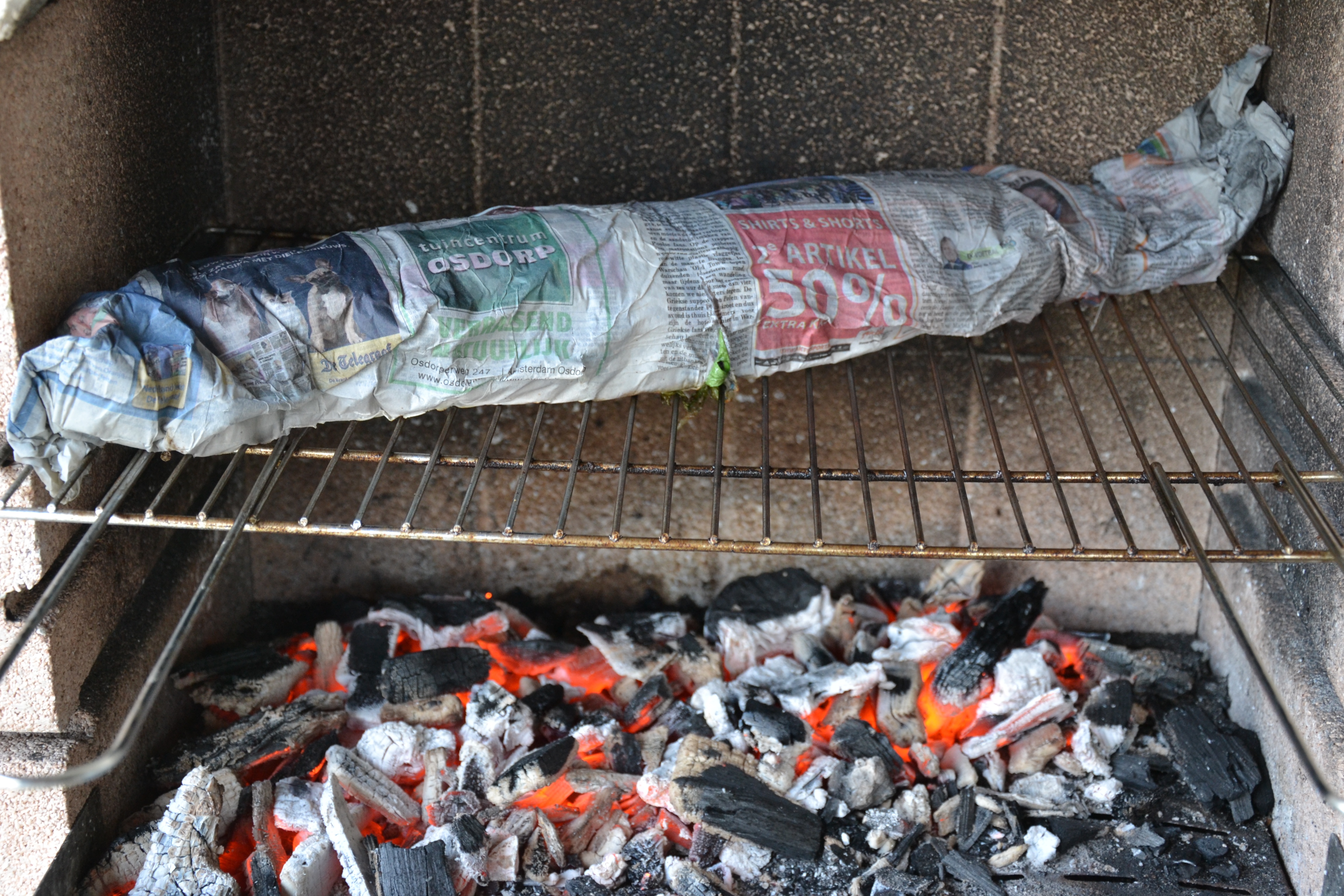 Hoe lang de vis precies moet hangt af van de hitte van het vuur en de grote van je vis. Maar als je de vis niet te dicht boven het vuur legt (of het vuur aan de matige kant houdt) en de krant zwart geblakerd is aan de buitenkant, dan zit het wel goed. Scheur het pakket aan tafel open en schep de moten zalm van de graat af. lekker met aardappeltjes, venkelsalade en een lik aioli.