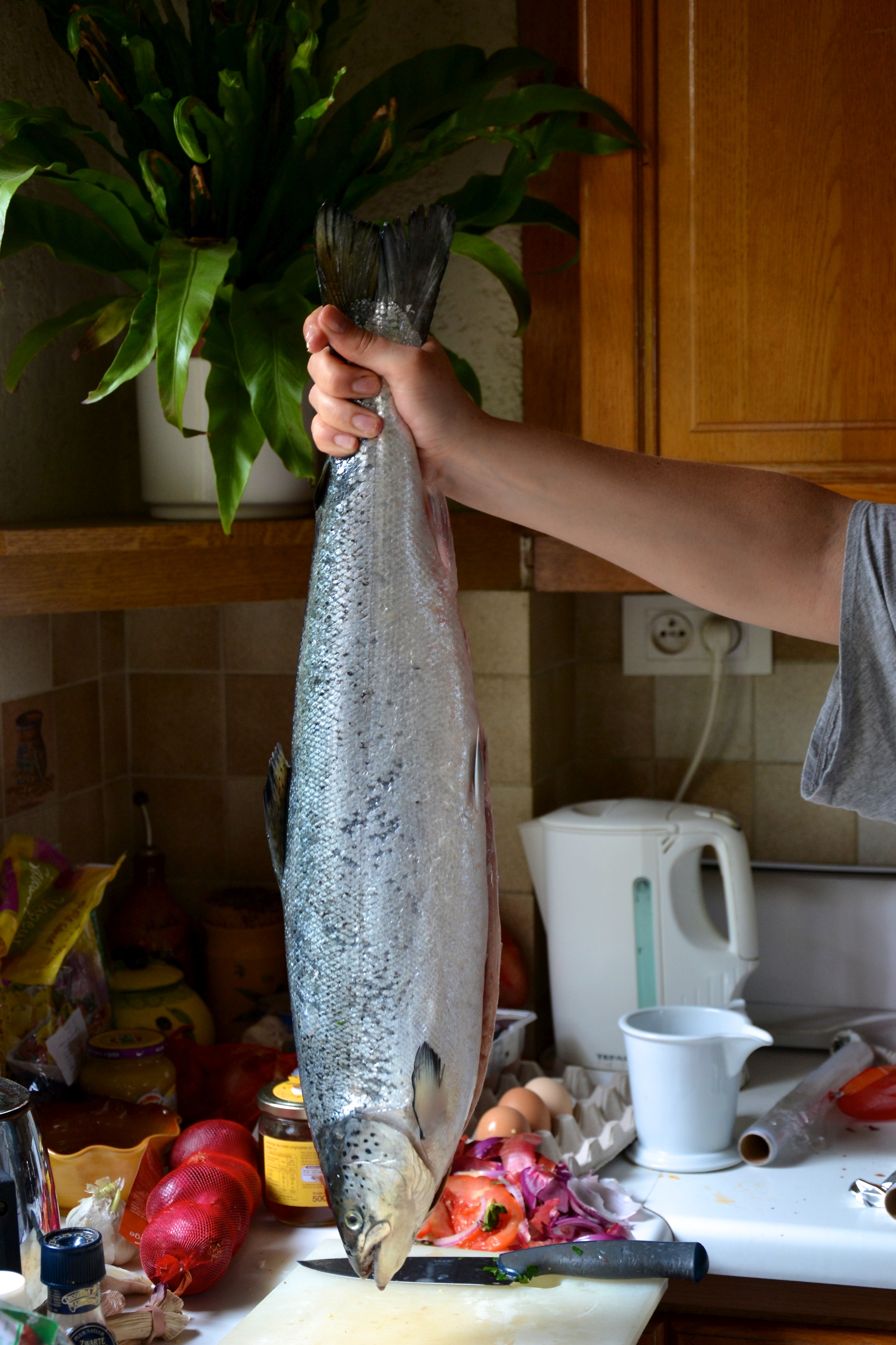 Als je iemand een natte krant noemt, betekent dat meestal niet veel goeds. Maar uit een natte krant kan wel iets goeds komen. Een perfect gegaarde zalm bijvoorbeeld. Het is al jaren geleden dat ik Jamie Oliver, in één van zijn eerste series, met een hele zalm gewikkeld in krantenpapier en een barbecue op het strand bezig zag. De natgemaakte krant zorgt ervoor dat de zalm niet in één keer te veel hitte krijgt en langzaam gaar stoomt. Toen ik in Frankrijk hele zalmen bij de o zo fijne hypermarché zag liggen moest ik onmiddellijk aan deze bereidingswijze denken. Toch de op één na opmerkelijkste bereiding van zalm die ik ken. Je schijnt namelijk ook een hele zalm te kunnen pocheren door ‘m, gewikkeld in vershoudfolie, een rondje in de vaatwasser te geven, Maar dat is een experiment voor een andere dag.