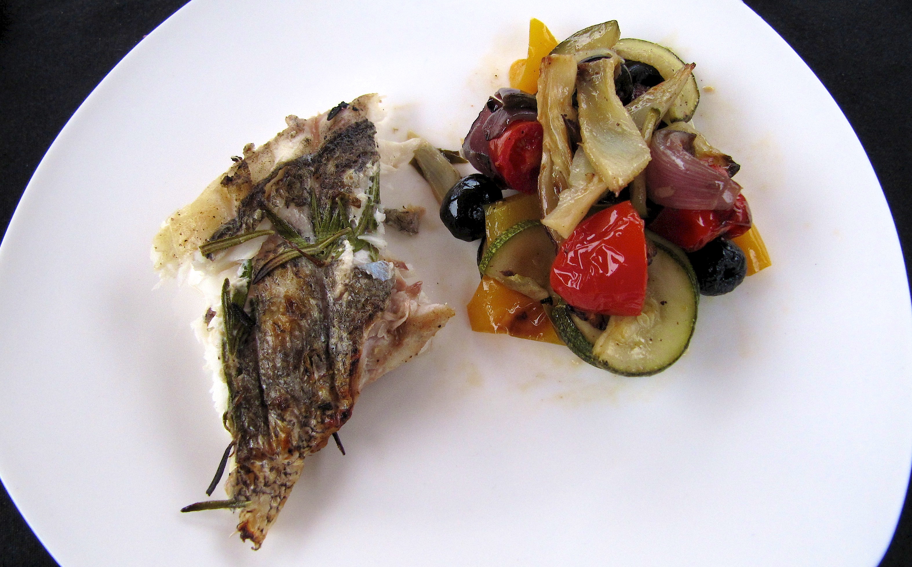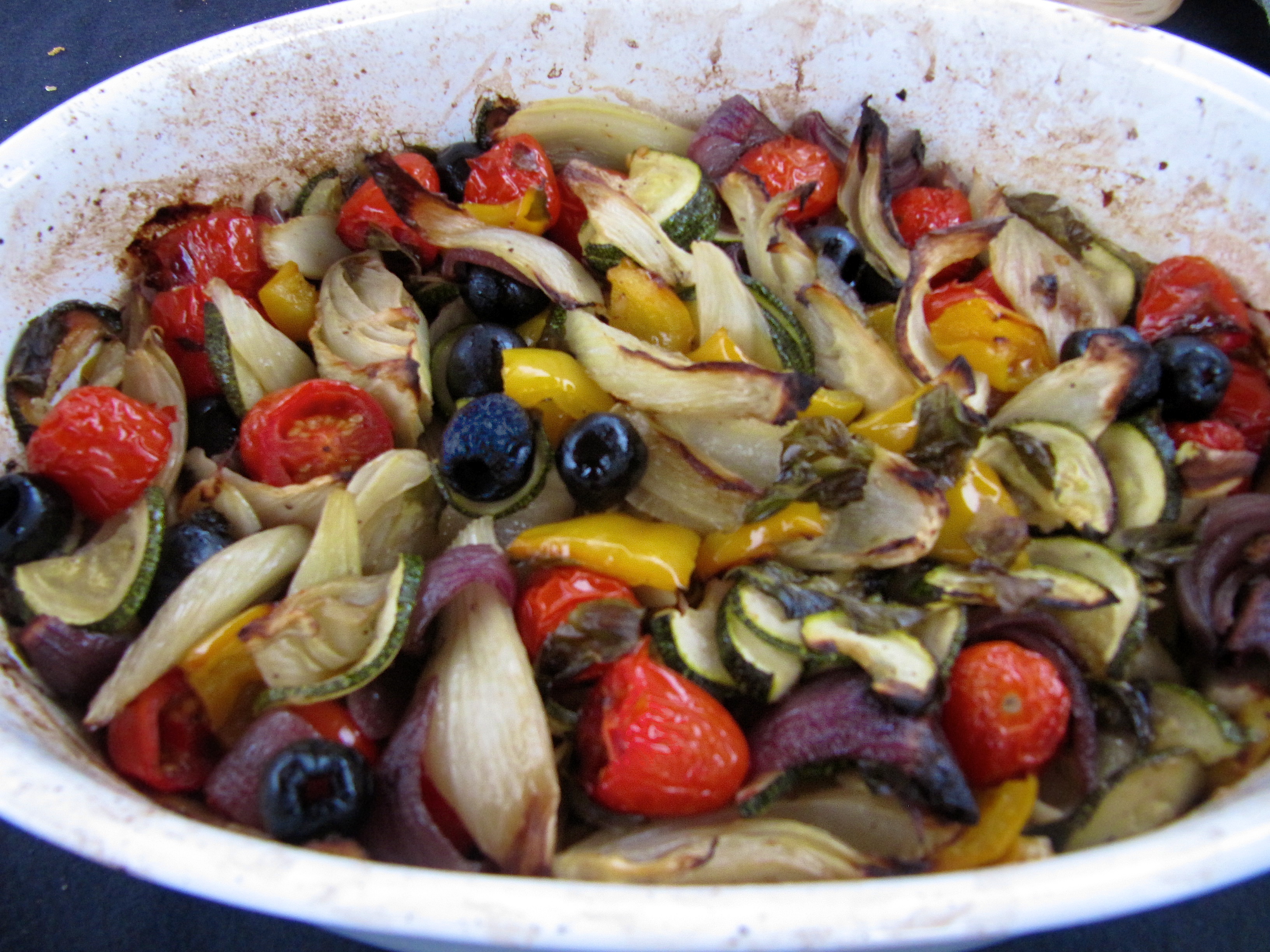 Hoe het ook zij, we houden het eenvoudig vandaag. Met een ratatouille met venkel. Traditioneel is dit een stoofpotje met courgette, aubergine, paprika, ui, tomaat en knoflook. Ik vind het net iets lekkerder uit de oven, omdat de geroosterde groenten dan wat zoeter zijn. Aubergine vind ik niet zo spannend, de anijsachtige smaak van venkel des te meer. Tenslotte gooi ik er ook nog wat olijfjes bij, tegen de heimwee.