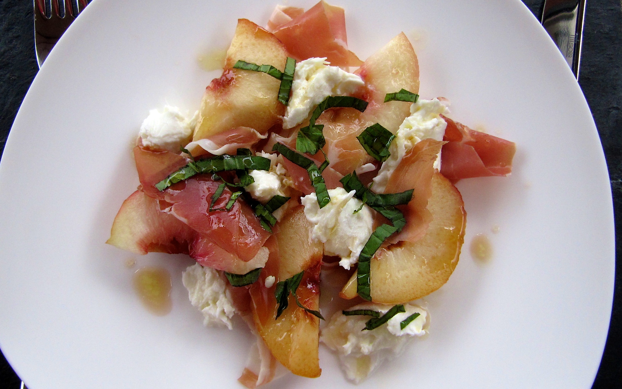 Wilde perziken zie de laatste jaren steeds meer bij de groenteboer en op de markt. Ze zijn natuurlijk alles behalve wild, maar dat geeft niet, ongetemdheid is niet een kwaliteit die ik doorgaans in fruit zoek.. De wilde perzik is platter dan zijn tamme neef en heeft witter vruchtvlees. De smaak is ook iets anders. Maar in dit gerecht kun je natuurlijk ook prima normale perzikken gebruiken. Over de buffelmozzarella valt echter niet te onderhandelen, die is echt veel lekkerder dan zo’n rubberen bal van goedkope koemelkmozzarella. En de gedroogde ham, tja, of die nou uit het Schwarzwald of Parma komt, als de kwaliteit maar goed is, anders heb je toch echt jezelf ermee.