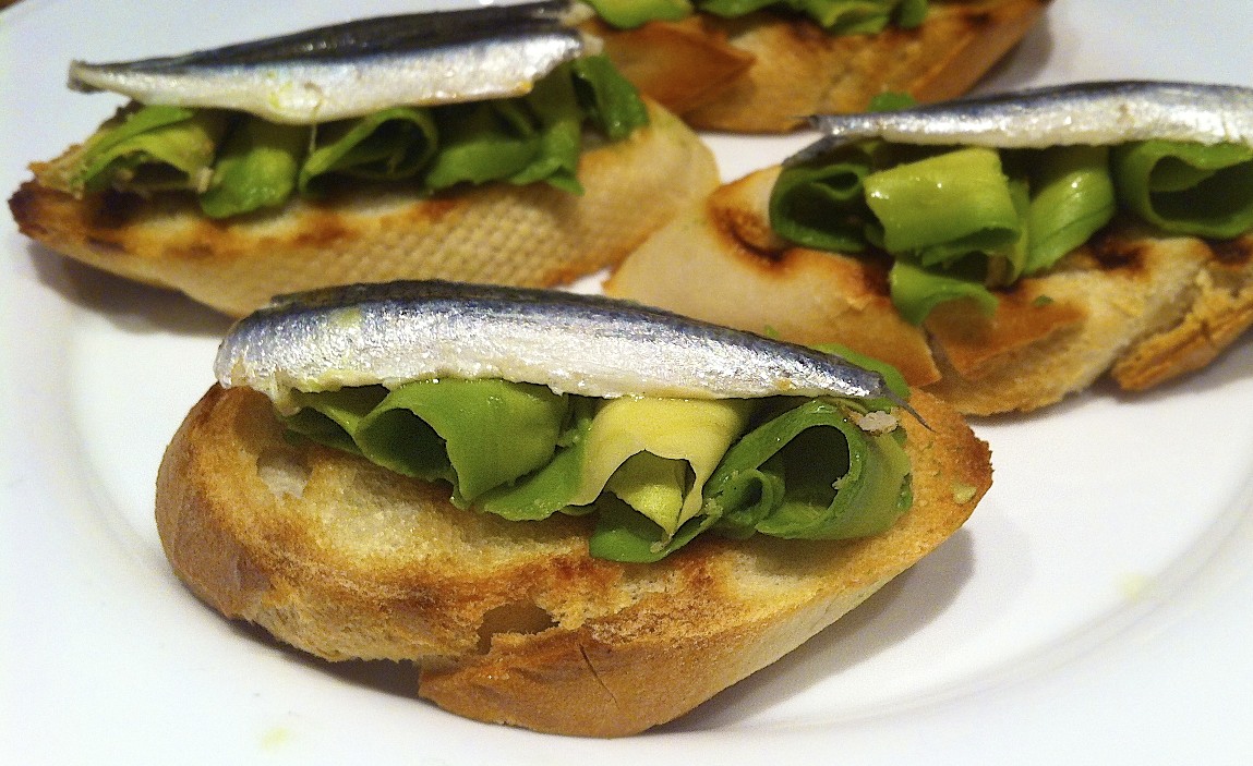 Snij het stokbrood in sneetjes, niet te dik. Smeer aan beide kanten in met olijfolie en grill in een hete grillpan of contactgrill, zodat je mooie streepjes krijgt. Schil de avocado. Pak hiervoor een dunschiller om dunne plakjes van de avocado te halen. Houd hiervoor de avocado vast en haal de plakjes van de onderkant, zodat ze van de avocado afvallen. Als je aan de bovenkant snijdt blijven de plakjes op de avocado liggen en plakken en dan krijg je ze niet meer heel los. Rol de plakjes op en leg op het broodje. Knijp er wat limoensap over. Trek wat sliertjes van de lente-ui met een juliennesnijder en leg twee sliertjes op de avocado (niet zichtbaar op bovenste foto). Leg tenslotte een ansjovisje erop.