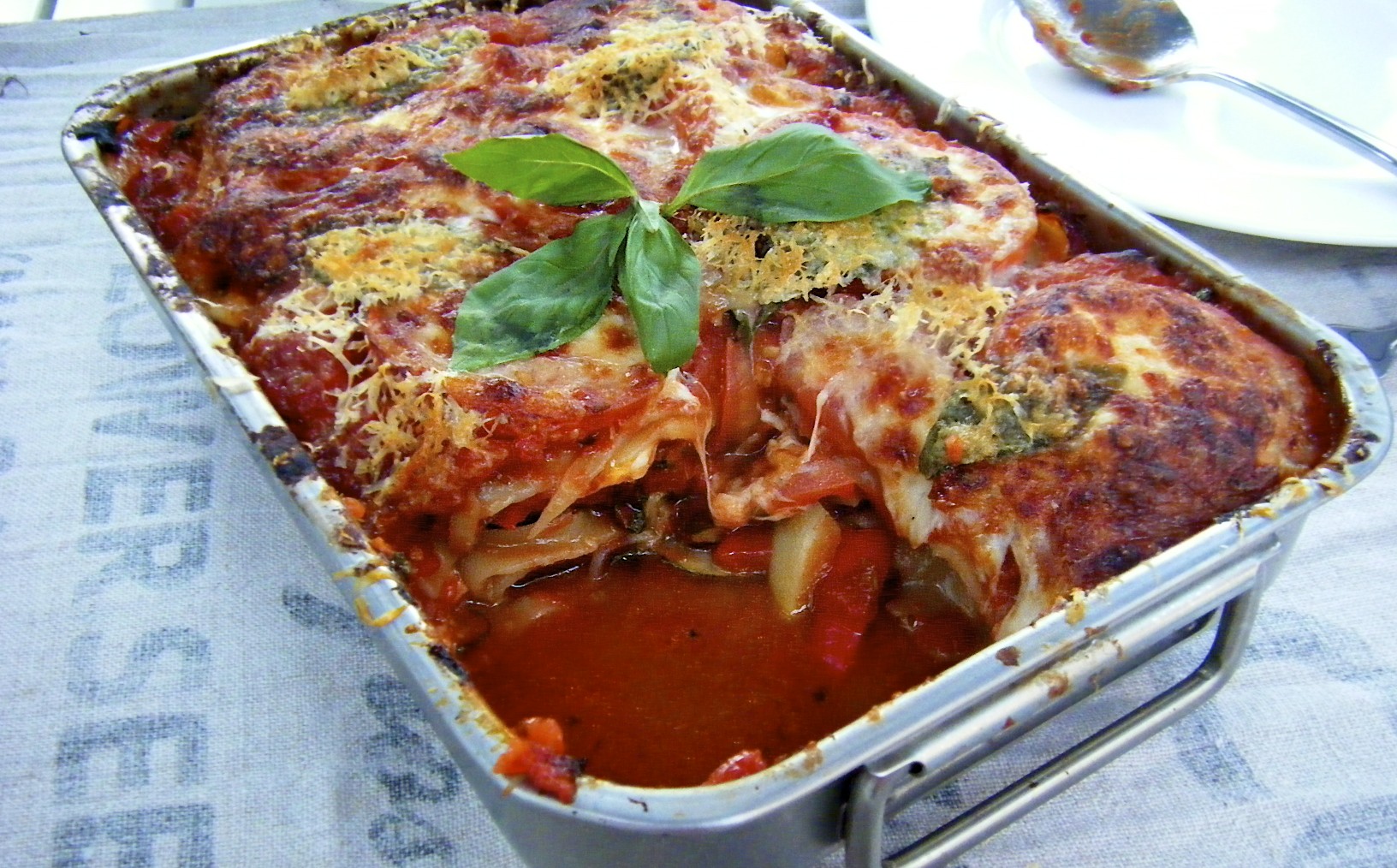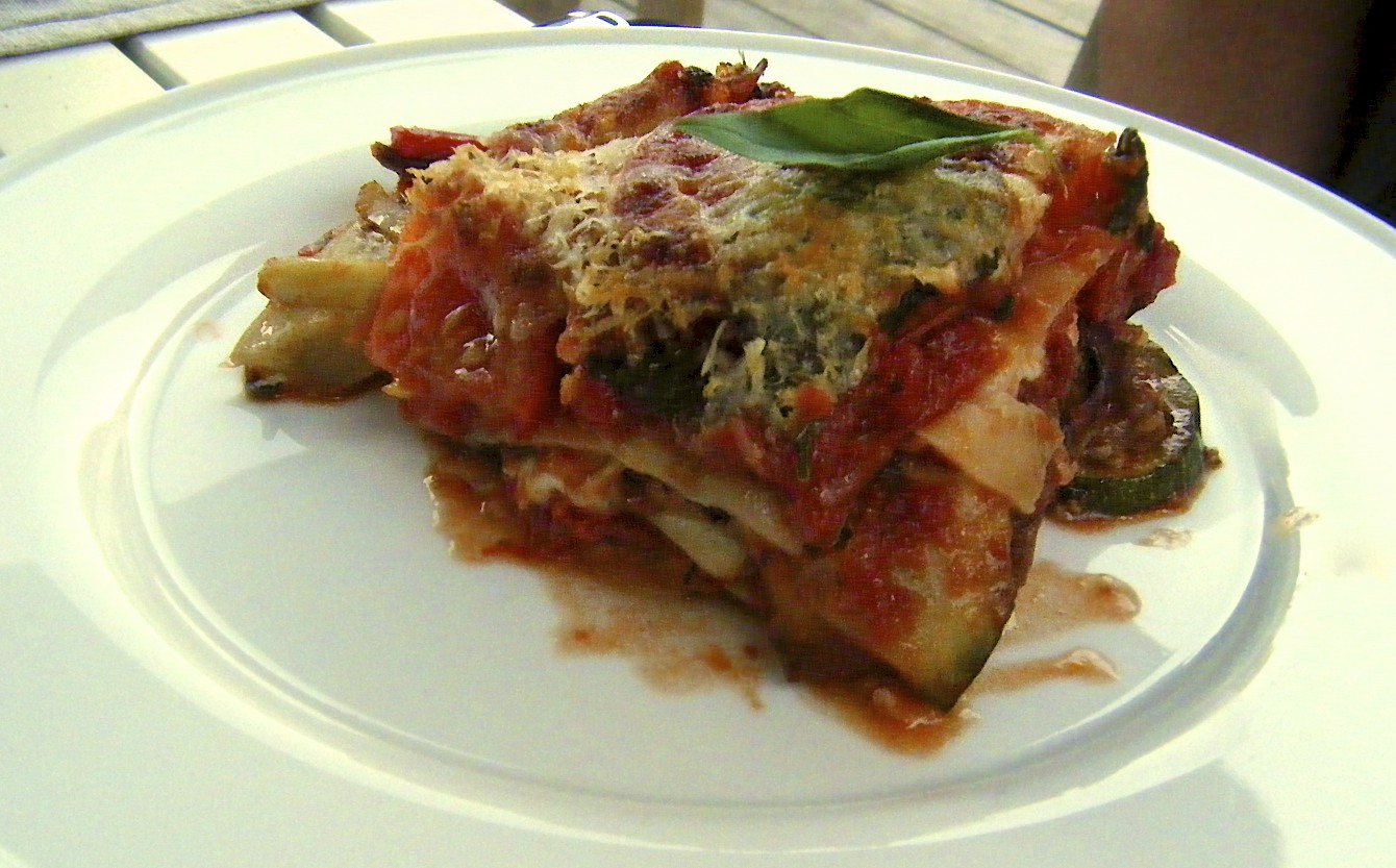 Pak de ovenschaal. Begin met een laagje saus, dan de groente, mozzarella, tomaten, lasagnevellen en dan weer saus, etc. Eindig met een flinke laag fijngeraspte parmezaanse kaas. Zolang de lasagnevellen maar onder de saus komen kun je niet echt fout gaan. Zet 30 minuten in de oven, tot de kaas gesmolten is en de saus bubbelt.
