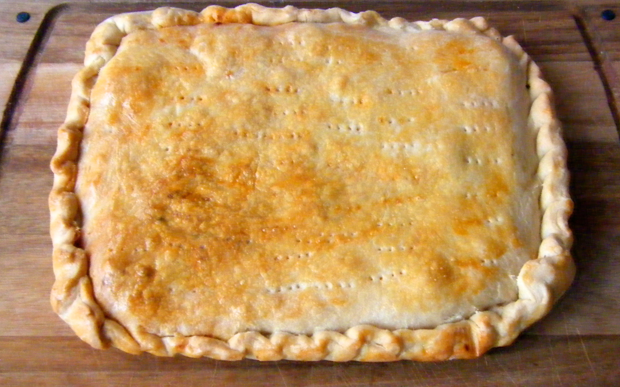 Neem het deeg uit de koelkast en verdeel het, als je de grote taart maakt, in twee delen, één deel groter dan de ander. Rol beide delen uit tot een rechthoek, de één groter dan de ander. Leg de grote plak op een met ingevet bakpapier bekleedde bakplaat. Op de grotere plak verdeel je het tonijnmengsel, bestrijk rond de randen met het eigeel. Bedek dan met de kleinere plak. Vouw de randjes om naar boven en knijp ze samen. Bestrijk het nu geheel met het ei. Prik met een vork een paar keer in het deeg. Bak 35 tot 40 minuten, tot het goudbruin is.