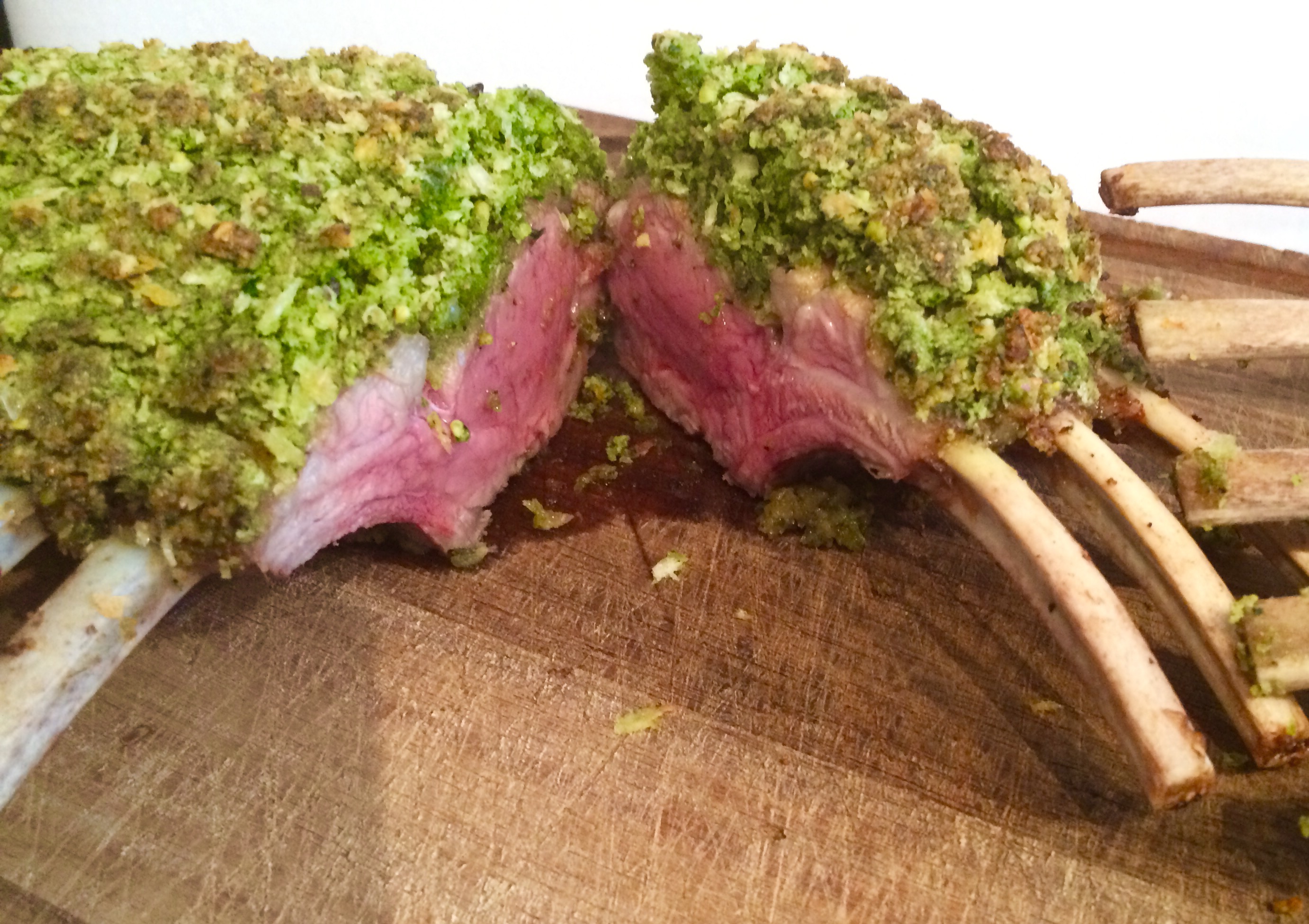 Verwarm de oven voor op 200°C. Zet een koekenpan op het vuur en laat goed heet worden. Doe wat olijfolie in de pan en bak het vlees in een paar minuten rondom bruin, zodat het een lekker korstje krijgt. Dit gaat het beste in een pan zonder anti-aanbaklaag. Doe de kruiden, de pistachenoten, knoflookteen, citroenrasp in een keukenmachine en maal alles fijn. Smelt de boter voorzichtig in de magnetron, de boter mag niet bruin worden. Meng dan ook de boter en de paneermeel door het pistachemengsel en breng het op smaak met peper en zout en zet even in de koelkast.