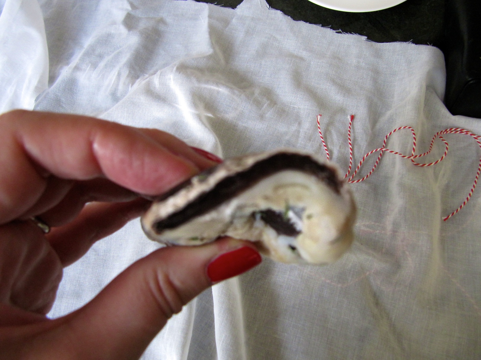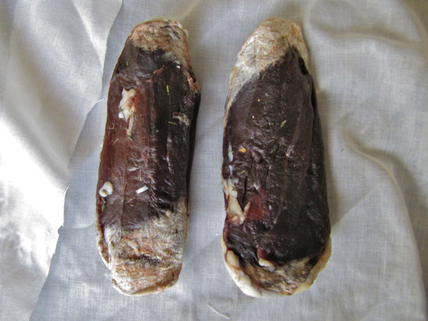 Klote, schimmel. Toen ik de eendjes uit de kaasdoek wikkelde bleken de puntjes wit uitgeslagen door de schimmel. Het lijkt wel een beetje het thema van de projecten te worden, de fungi. Voor ik ze in de vuilnisbak gooide er toch maar even een googlestudie erop los gegooid. Het bleek mee te vallen. Meneer Wateetons, geniaal amateur/experimenteel worstenmaker, haalde heerlijke ham onder het pluizige laagje vandaan. Ibericohammetjes krijgen zelfs express een wit laagje. Volgens deze slagersinfo kun je de schimmel er met zout water afborstelen, zolang het maar niet naar binnen toe geslagen is.