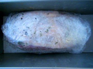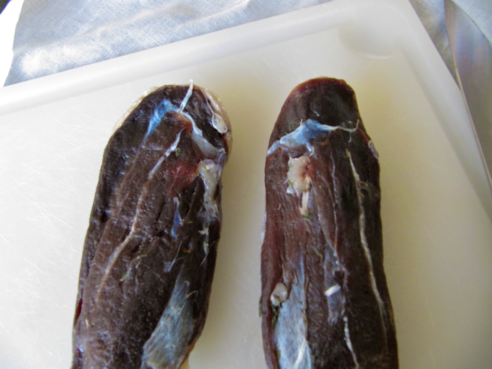De filets mogen nu uitgepakt worden. Als het goed is is er flink wat vocht uit de filets gekomen en voelt het vlees een stuk steviger en compacter aan. Pak nu twee stukken schoon kaasdoek en wat slagerstouw. Spoel het zout van de eend af onder de kraan en dep daarna goed droog met keukenpapier. Er bleef bij mij wel wat tijm aan het vlees pakken, maar hoe meer anti-bacteriële werking, hoe beter leek me, dus ik liet het maar zo. Rol de filets in een dubbele laag kaasdoek en knoop aan twee kanten vast met het touw, zorg voor een lusje aan één kant.