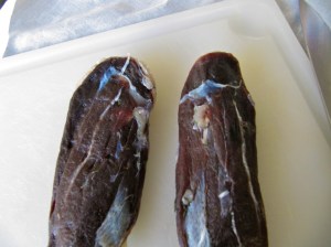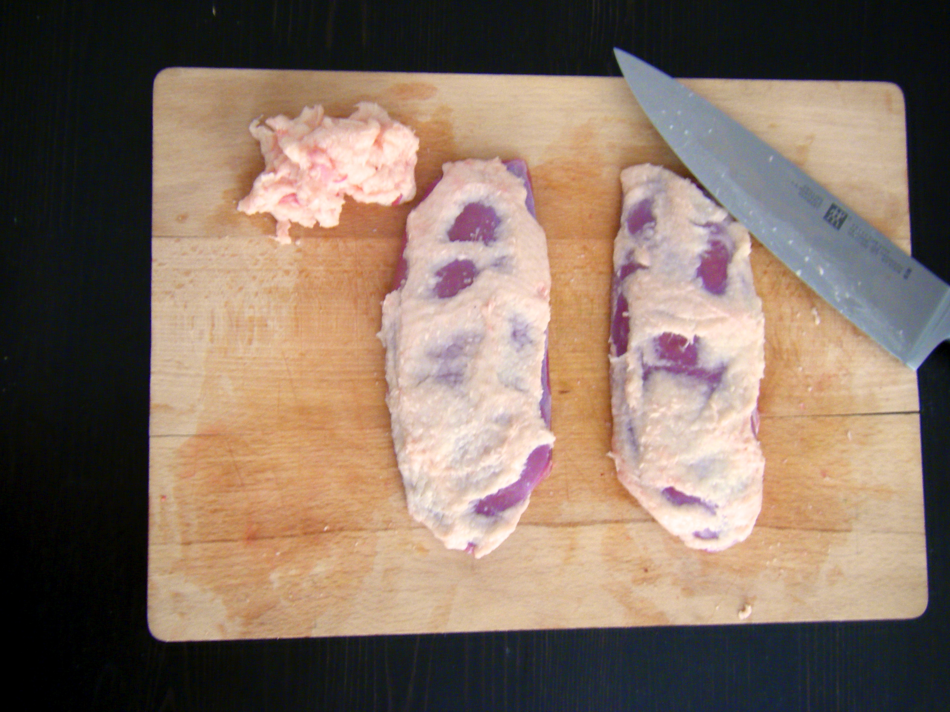 Als eerste moet de vel van de borst gesneden worden, terwijl je een laagje van 3 mm. vet overhoudt. Dat is niet gemakkelijk. Ik weet niet of het aan m’n knife skills ligt (ik ben wel vrij handig met het fileren van visjes) of aan de magere borstjes, maar ik krijg het er niet netjes in één keer vanaf. Het eindresultaat is wat, tja, oneffen. Het vet moet smaak geven en het vlees beschermen, maar aangezien het überhaubt maar aan één kant zit, lijkt het me niet essentieel dat het een ongeschonden laag is. Dat hopen we in ieder geval dan maar. De huid wordt niet weggegooid maar opgerold in plasticfolie en ingevroren, zodat het later nog gebruikt kan worden, maar daar kom ik over een week of twee op terug.