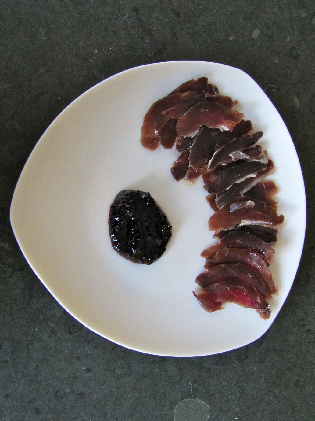 Dun gesneden, het vet er een beetje af, ziet het er best mooi uit, vind ik. Ik serveer de ham dungesneden met ketchup au cassis, een ketchupje gemaakt van zwarte bessen dus. Hadden we nog staan. Maar anders had ik waarschijnlijk een bramenchutney gemaakt, dat soort vruchten doen het goed met eend.
