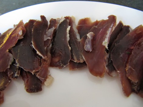 En dan proeven.. Het smaakt naar echte gedroogde ham, en het ketchupje smaakt er goed bij. Maar eigenlijk is ’t zonde. Want de smaak van het hammetje is heerlijk, tikkie zout, zoals dat hoort met ham, maar ook onmiskenbaar eend, een stevige, volle smaak, absoluut heerlijk. Een succes! Mits we hier morgen geen last van krijgen natuurlijk..