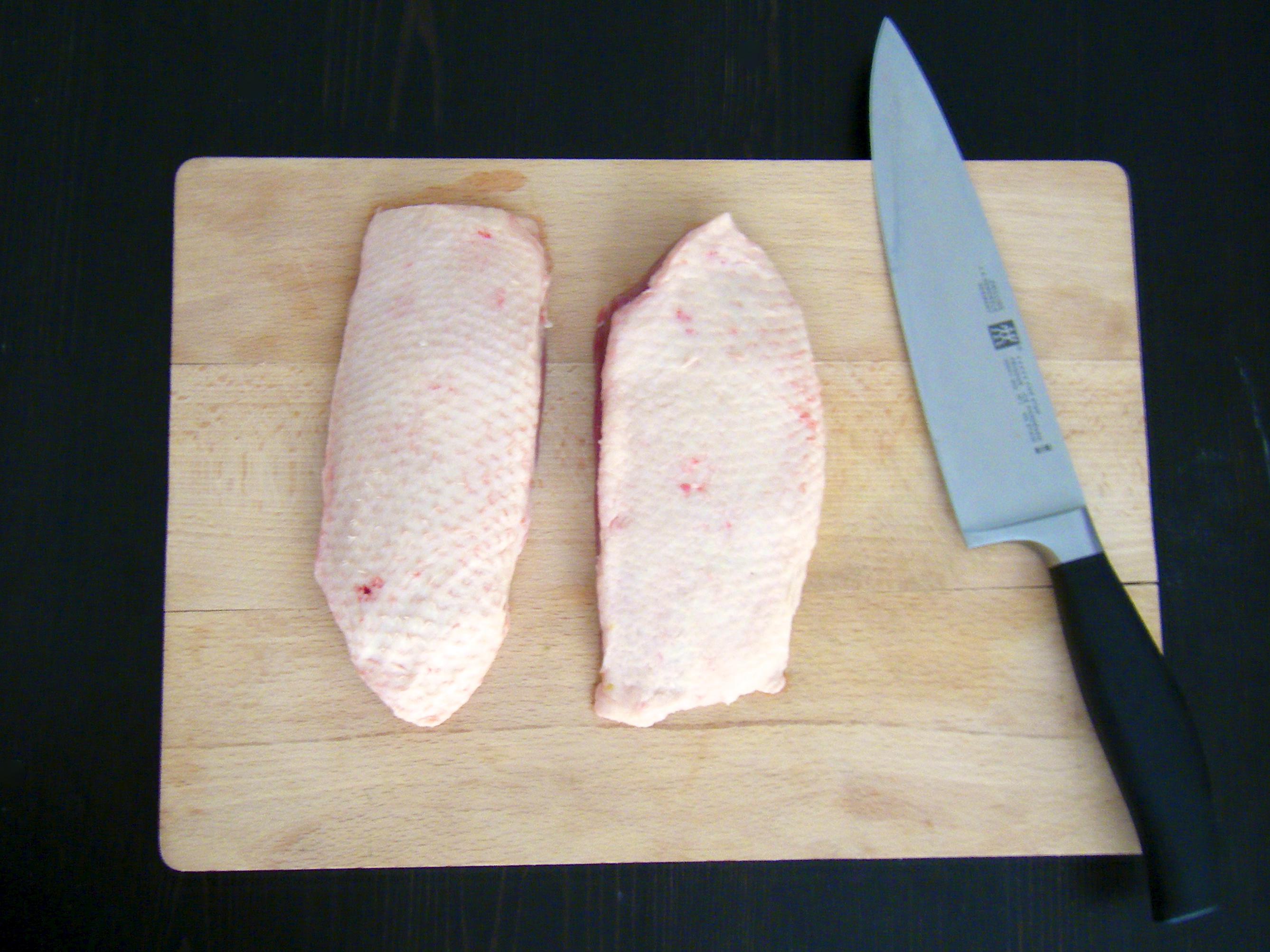 Men neme 2 eendenborstfilets. Die eend van meneer Blanc moet wel de Dolly Parton onder de eenden geweest zijn, want hij geeft een indicatie van 300 g. per borst. De filetjes die ik bij de Sligro haalde wegen dat samen..
