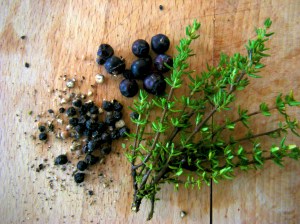 De volgende stap is het zouten van het vlees. Weeg grof zeezout af op 20% van het gewicht van de eendenborsten. En doe 1 tl. jeneverbessen en 2 tl. peperkorrels in een vijzel, kneus een beetje en haal de blaadjes van vier takjes tijm.