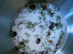 De tijm zorgt niet alleen voor smaak, maar heeft ook een anti-bacteriële werking, dat is mooi meegenomen. Meng de jeneverbessen, peper en tijm met het zout. Haal de filets door het zout.