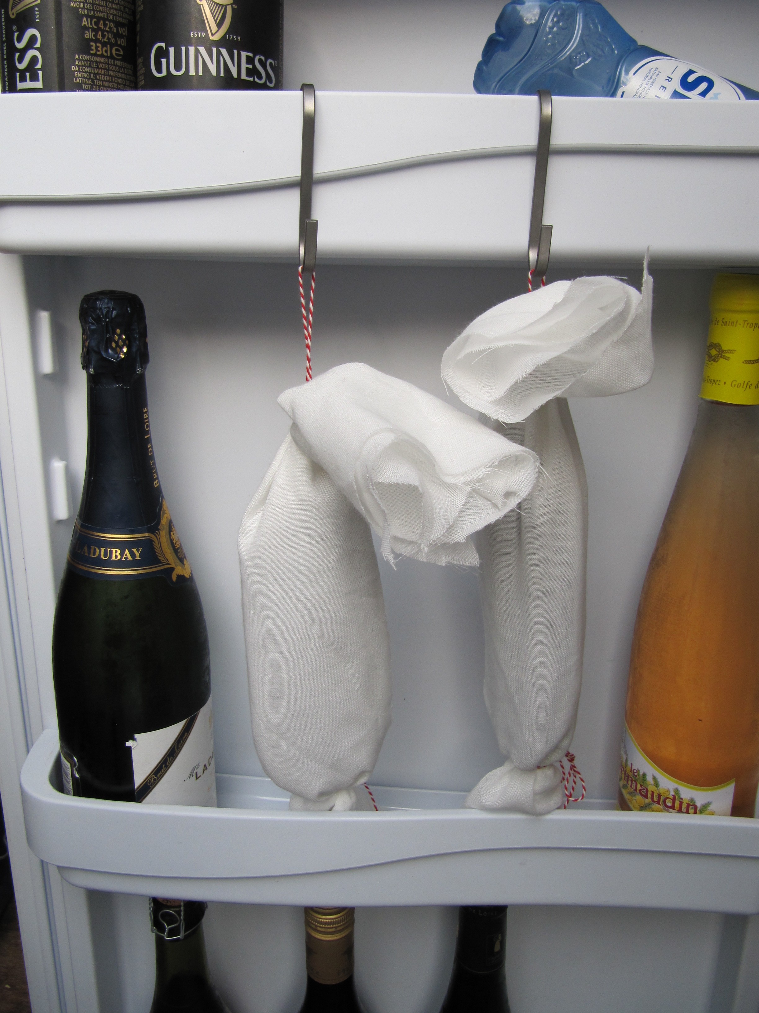 Hang de hammetjes-to-be 12-14 dagen in de koelkast, die maximaal 4° C koud is. Het is belangrijk dat de lucht vrij om de hammetjes kan circuleren, bij mij hangen ze in de deur. En nu is het afwachten….