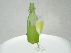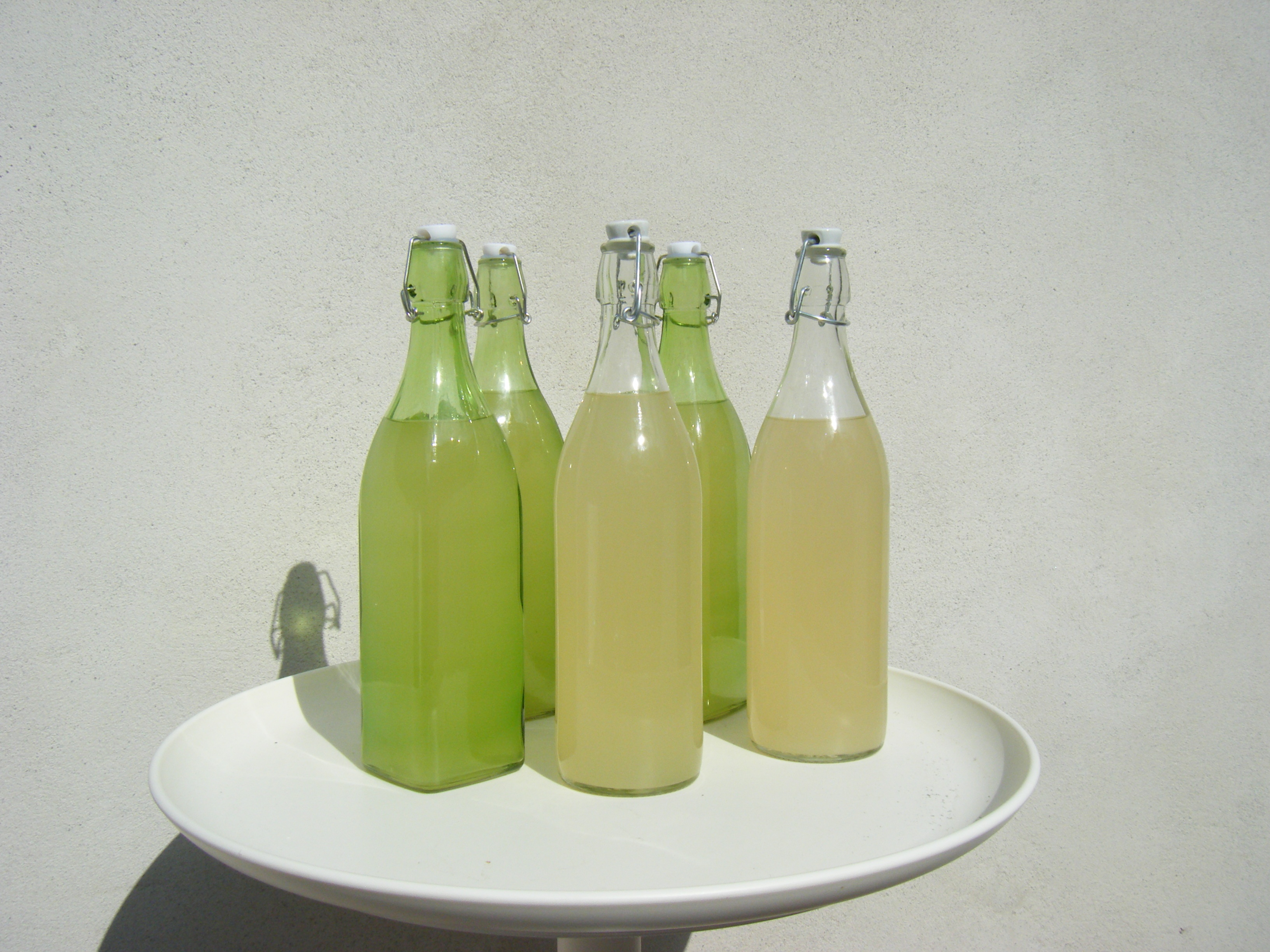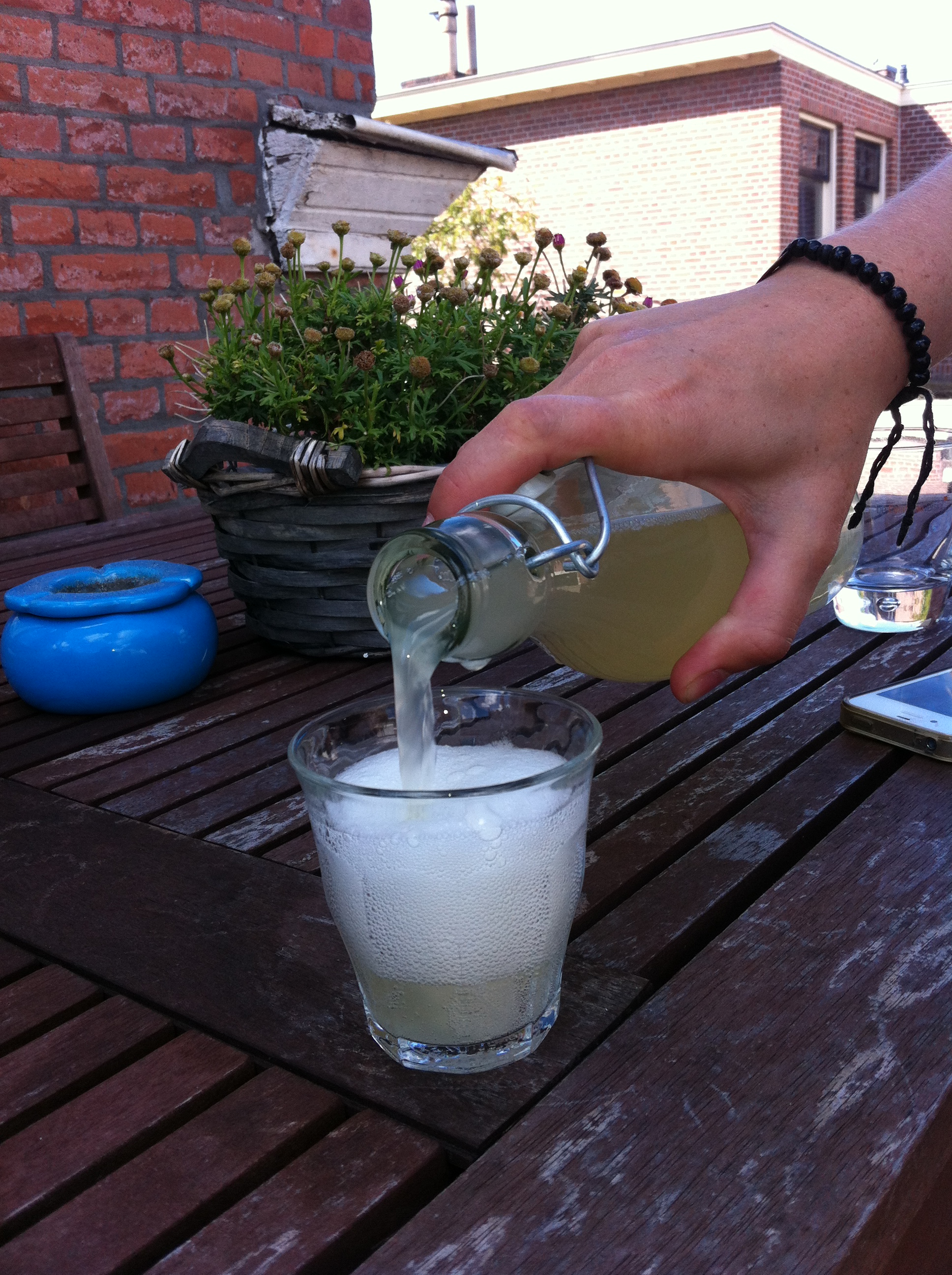De flassen hebben nu zo’n week op een koele plek gestaan. Tijd om het eerste flesje te proeven! Een zacht plofje is hoorbaar bij het openen van de beugel. Toch een tikkie vergisting, maar niet veel. Er is gelukkig niets ontploft en in ben niet onder een soort geiser van vlierbloesemsap terecht gekomen (kan allemaal, volgens internet), maar ik had toch liever een wat stevigere bubbel gehad, en een flinke plof bij het openen. Inmiddels ben ik er wel achter wat er waarschijnlijk misgegaan is; het hete water, waar de suiker in was opgelost, heeft de gist in de vlierbloesem kapot gemaakt. Volgend jaar eerst maar even laten afkoelen dus.