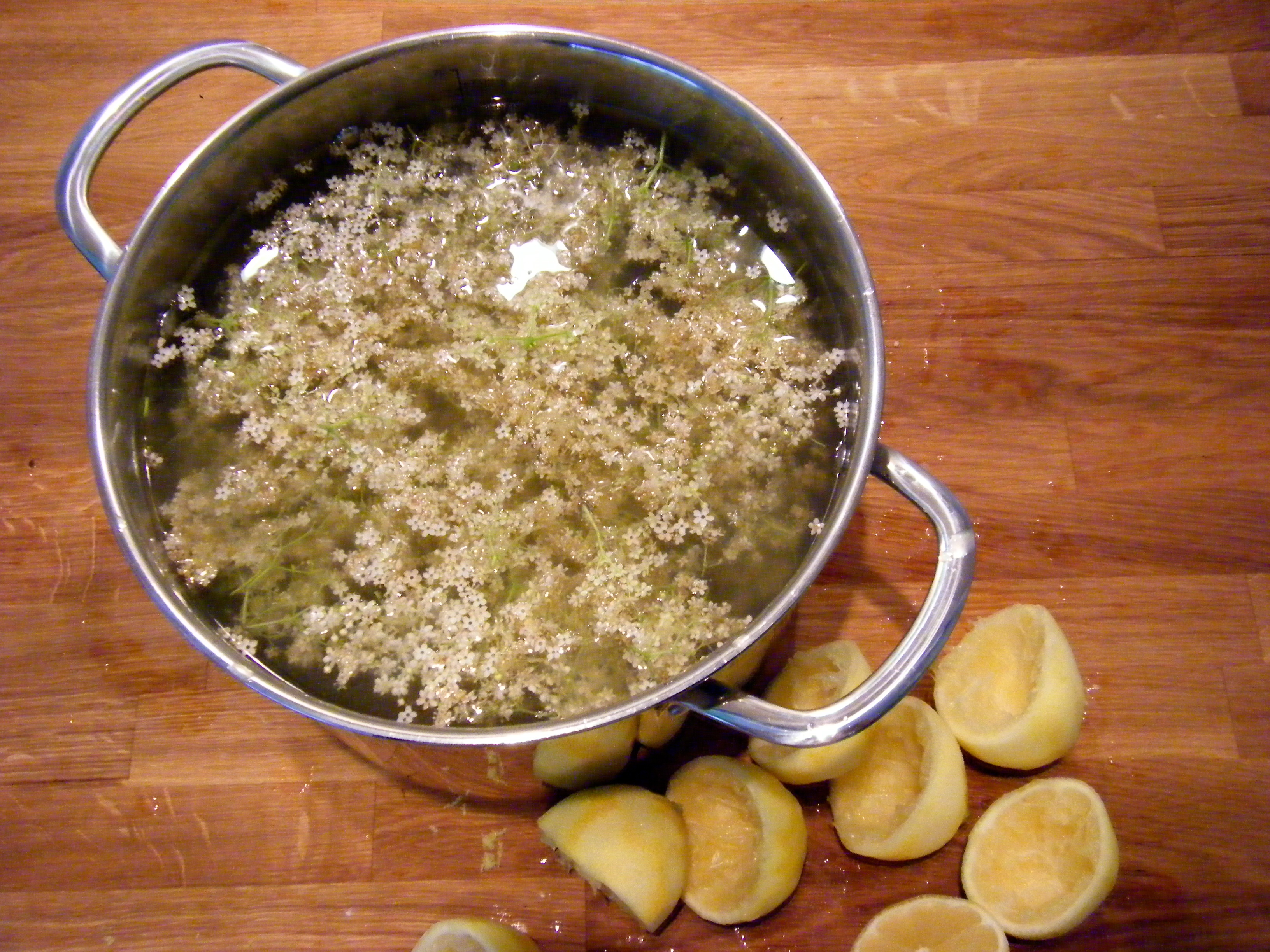 Los de suiker op in het hete water in een grote pan of brandschone emmer. Voeg 2 liter koud water toe. [update: Laat het water eerst afkoelen, anders dood je de natuurlijke gisten, zie eindresultaat.] Schud de bloemen goed uit om eventuele beestjes los te schudden (afspoelen is niet zo’n goed idee, je hebt het stuifmeel nodig), knip zoveel mogelijk de groene stelen weg. Doe de bloemen met het citroensap en -schil en de azijn bij het water en roer alles goed door.