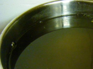 Ai, nog geen spoor van vergisting. Je zou nu iets van bruis of schuim moeten zien, zo niet, dan droge gist inschakelen. Ik heb dus snel een snuf gist toegevoegd, goed doorgeroerd en hopen dat het de komende vier dagen z’n werk gaat doen.