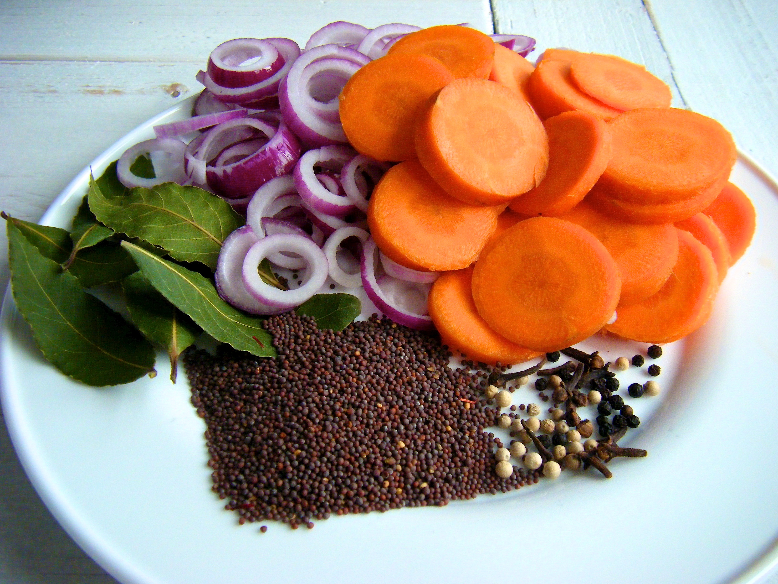 400 ml water, roer door tot de suiker opgelost is, haal van het vuur en laat afkoelen. Spoel de haringen af en dep droog met keukenpapier en zet de volgende ingrediënten klaar: